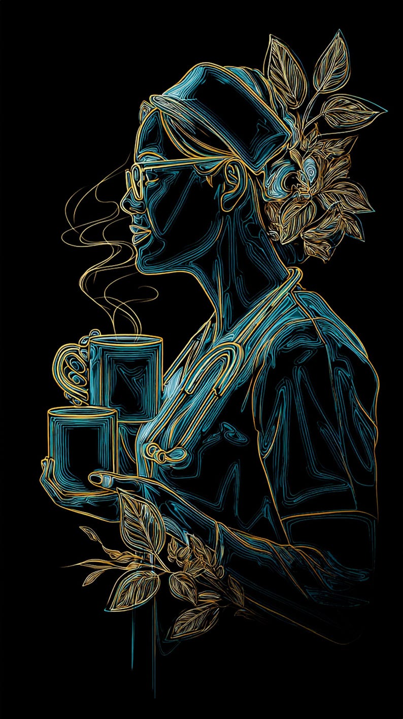 This artwork features a stylized nurse in profile with layered etched linework, warm botanical accents, a stethoscope detail, and coffee in both hands like she has fully accepted reality. The black, teal, and gold palette gives it a polished moody look that feels more elevated than the usual generic nurse gift clutter.