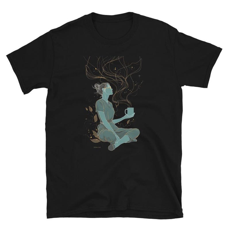 This artwork features a stylized nurse in scrubs holding coffee, surrounded by flowing golden linework and subtle botanical accents. The black background with teal and warm gold details gives it a moody, elevated look that feels more refined than the usual generic nurse gift clutter.