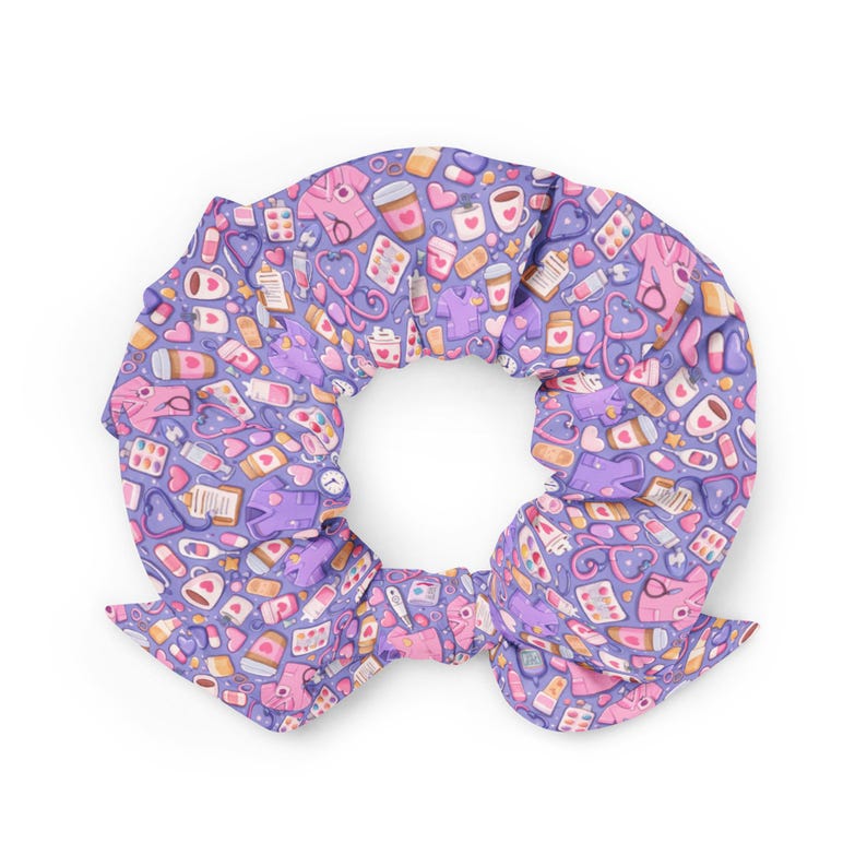 Cute Nurse Pattern for RN CNA Medical Hearts Coffee Coquette Healthcare Worker Recycled Scrunchie