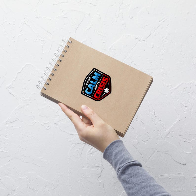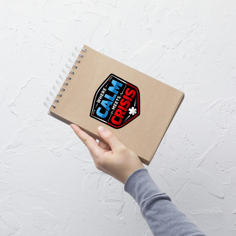 This artwork features bold badge style typography with the phrase Where Calm Meets Crisis, using blue and red lettering, ECG accents, and a medical star symbol in a strong shield layout. It feels confident, professional, and ICU coded without drifting into cheesy inspiration poster territory.