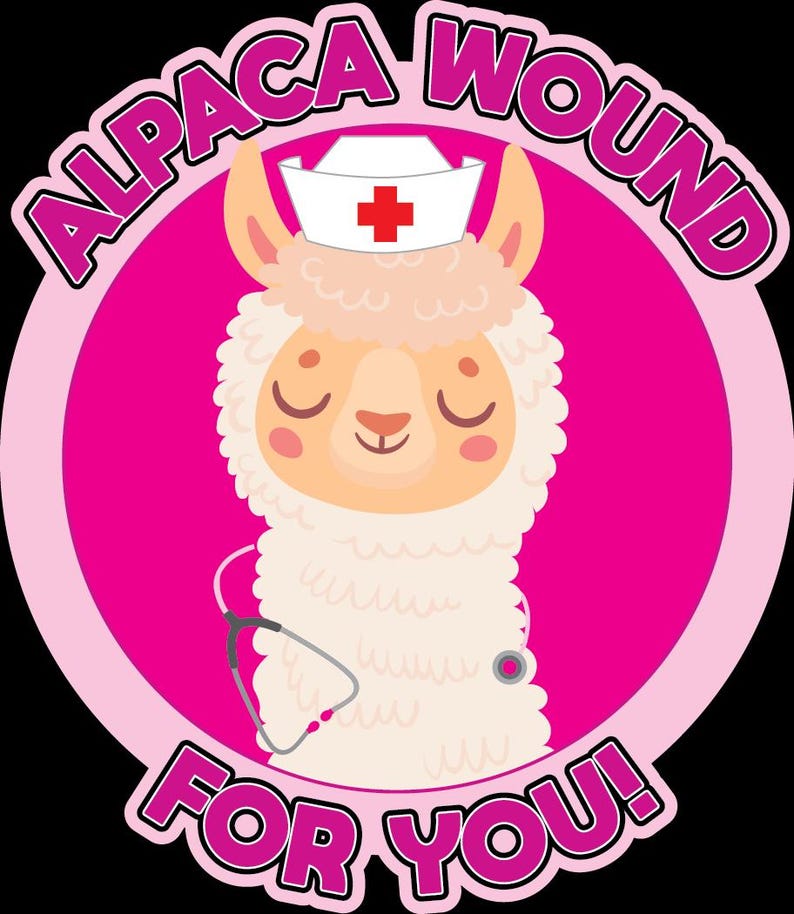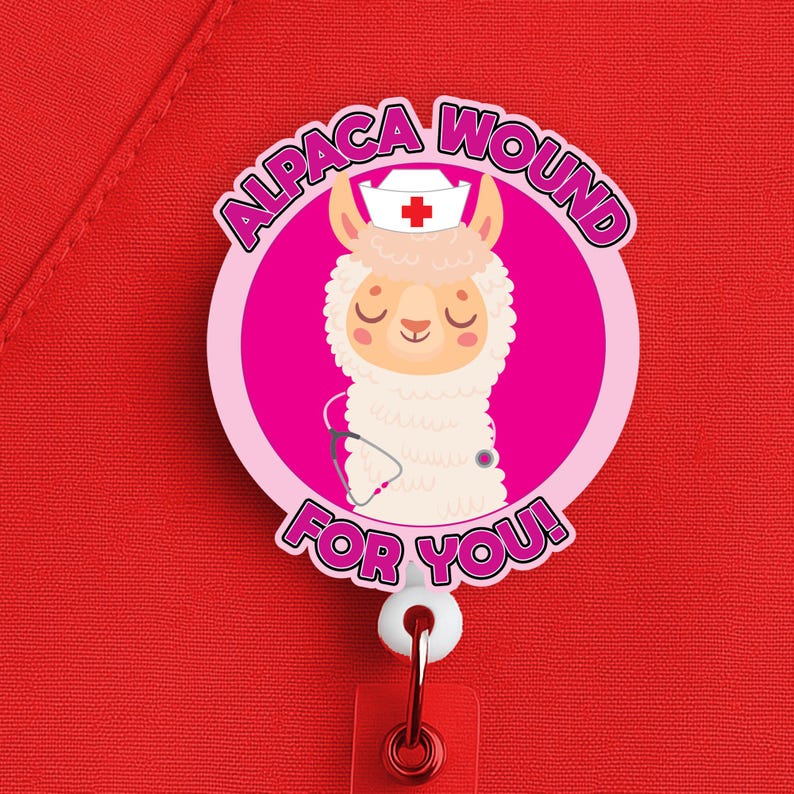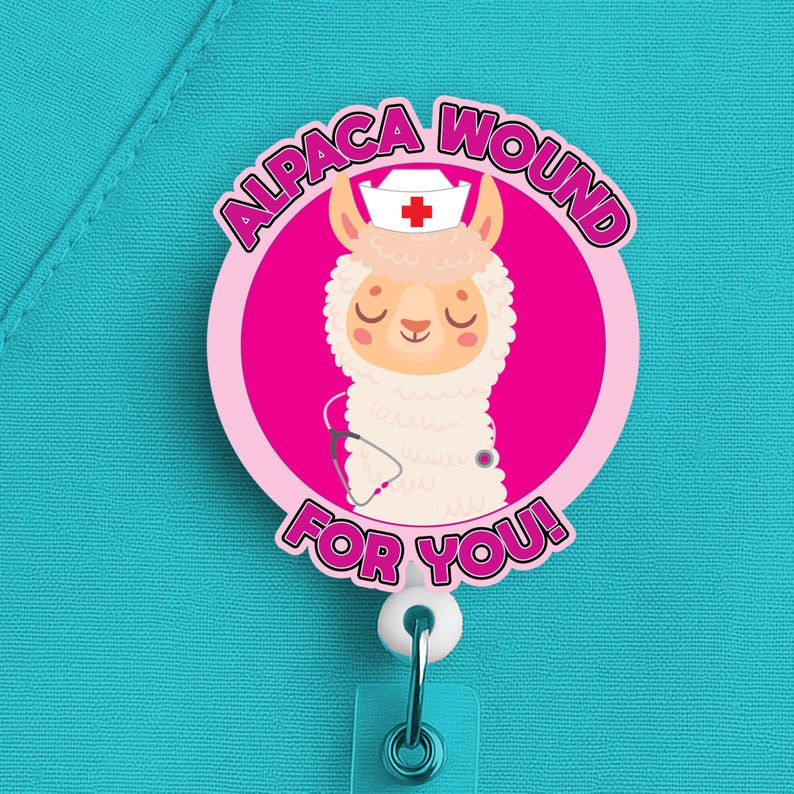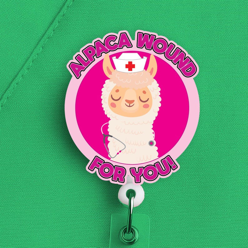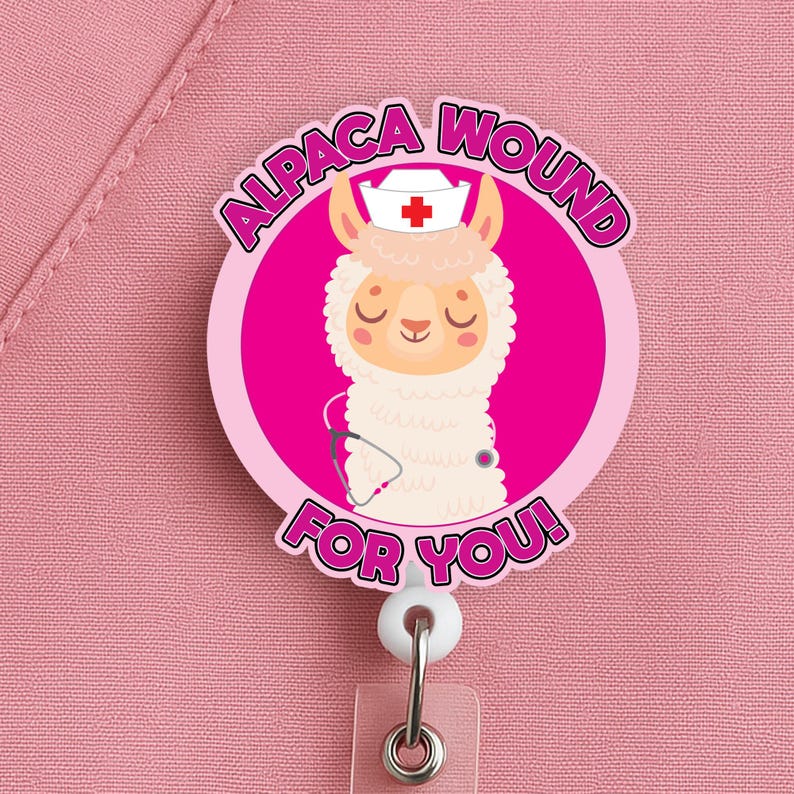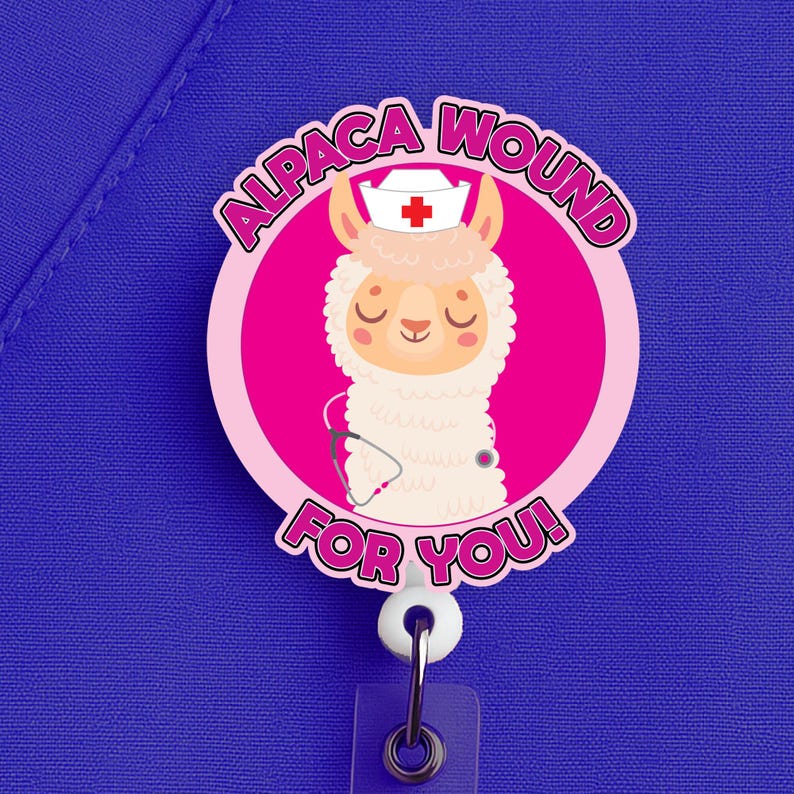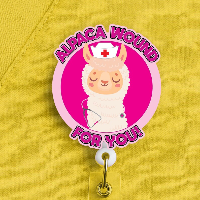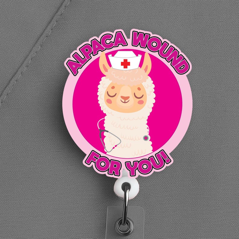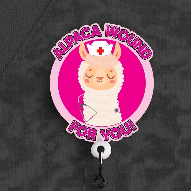 This wound care nurse badge reel features a cute alpaca nurse design with the phrase “Alpaca Wound for You,” made for wound care nurses, RNs, LPNs, CNAs, techs, and healthcare workers who appreciate a good medical pun and a badge reel that does not look boring.