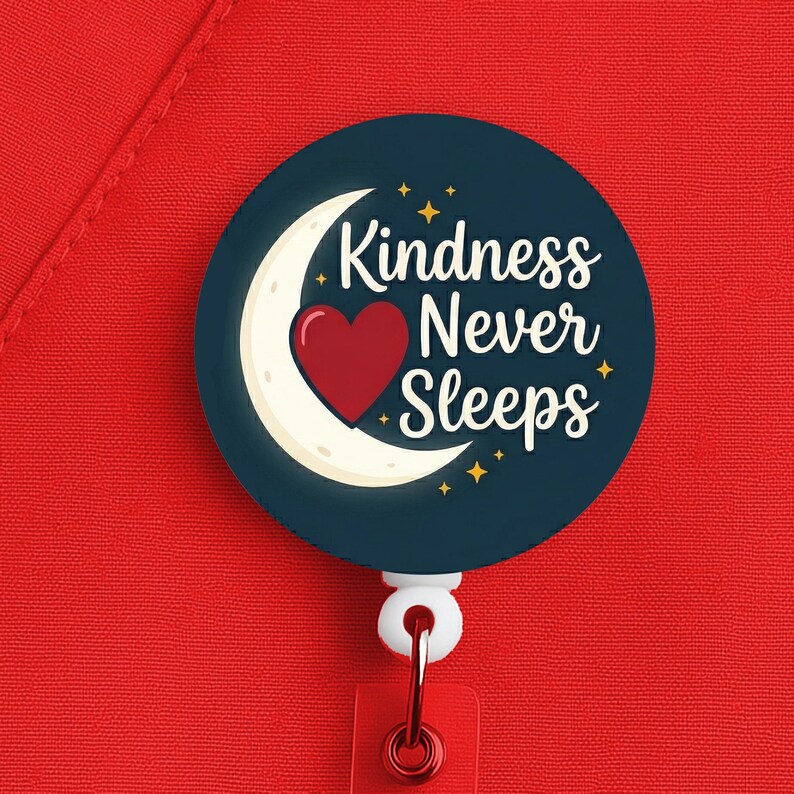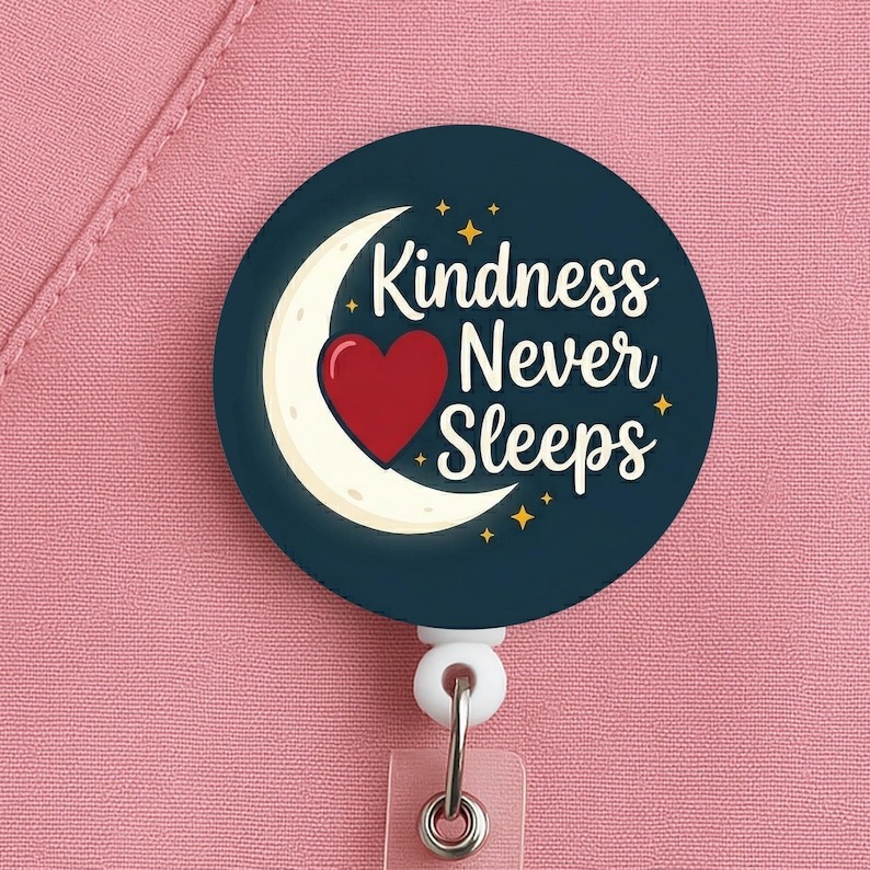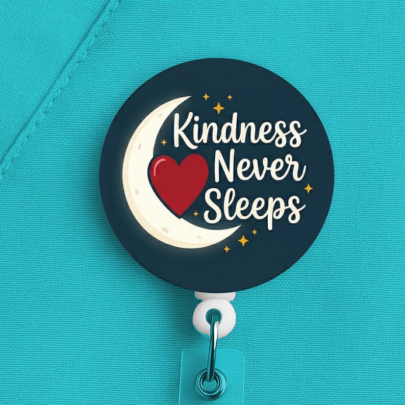 This night shift nurse badge reel features the phrase “Kindness Never Sleeps” in a soft, comforting design made for nurses, RNs, LPNs, CNAs, techs, and healthcare workers who work overnights and still manage to care for people with warmth and grace.