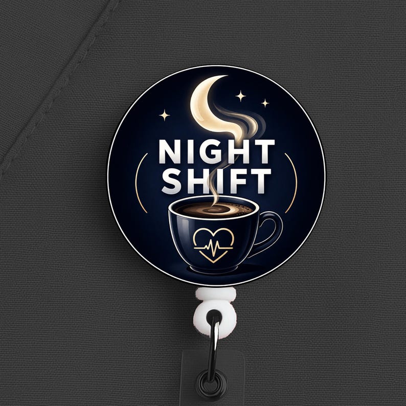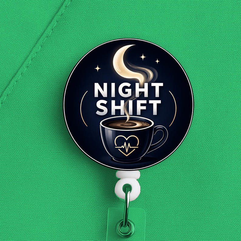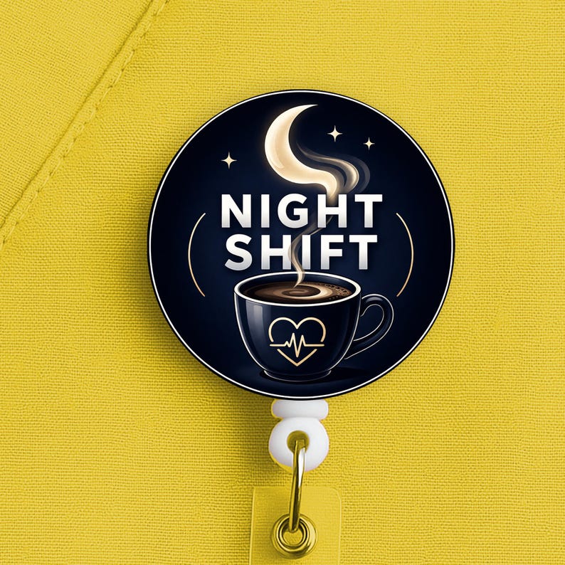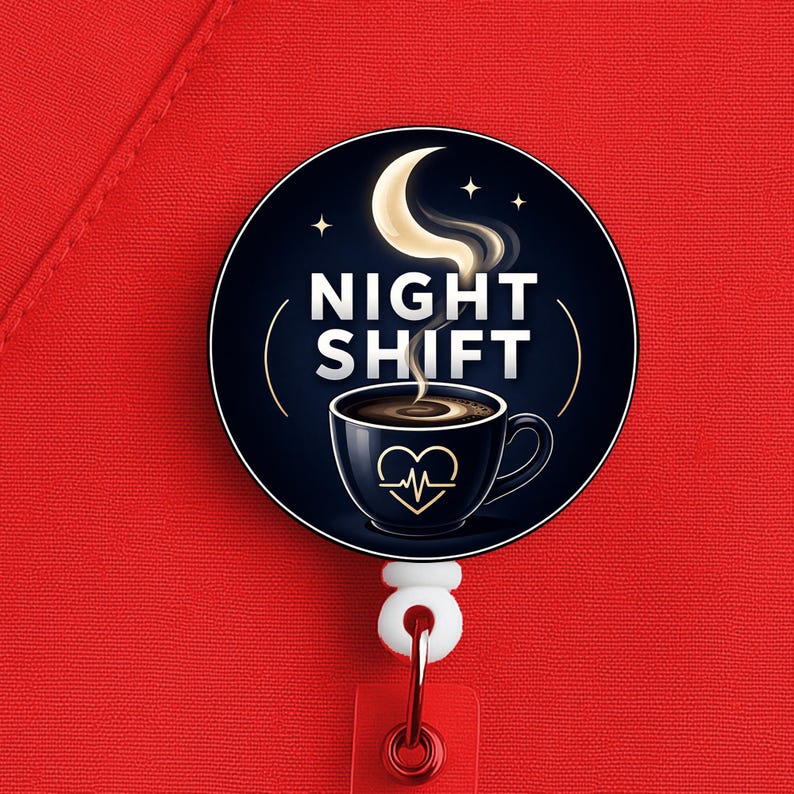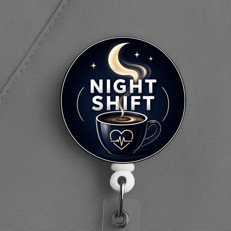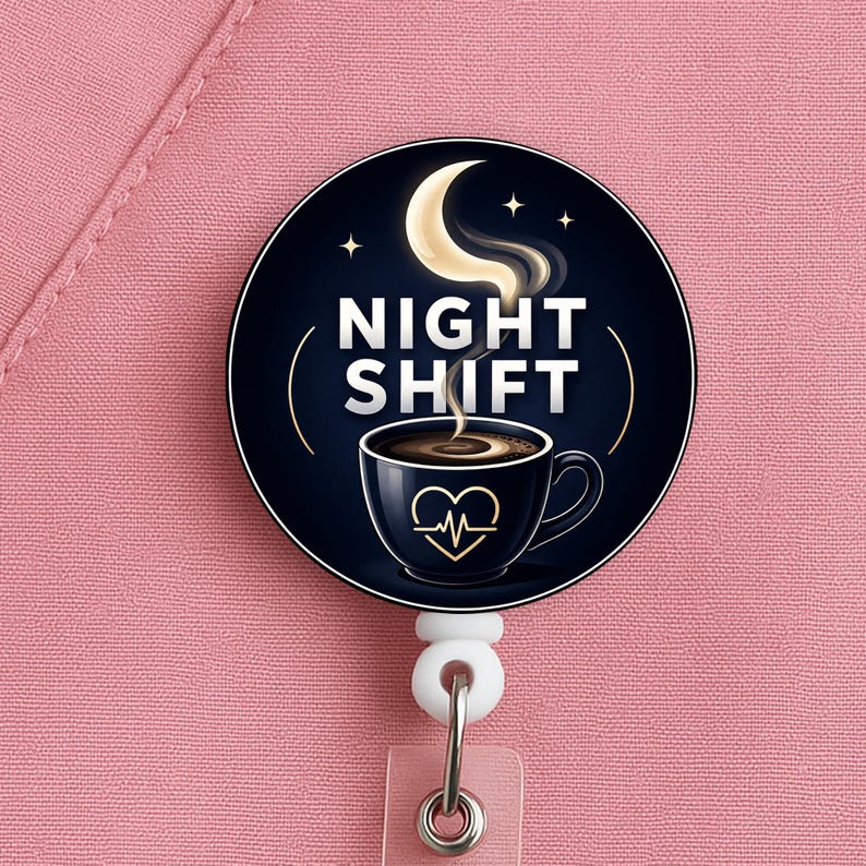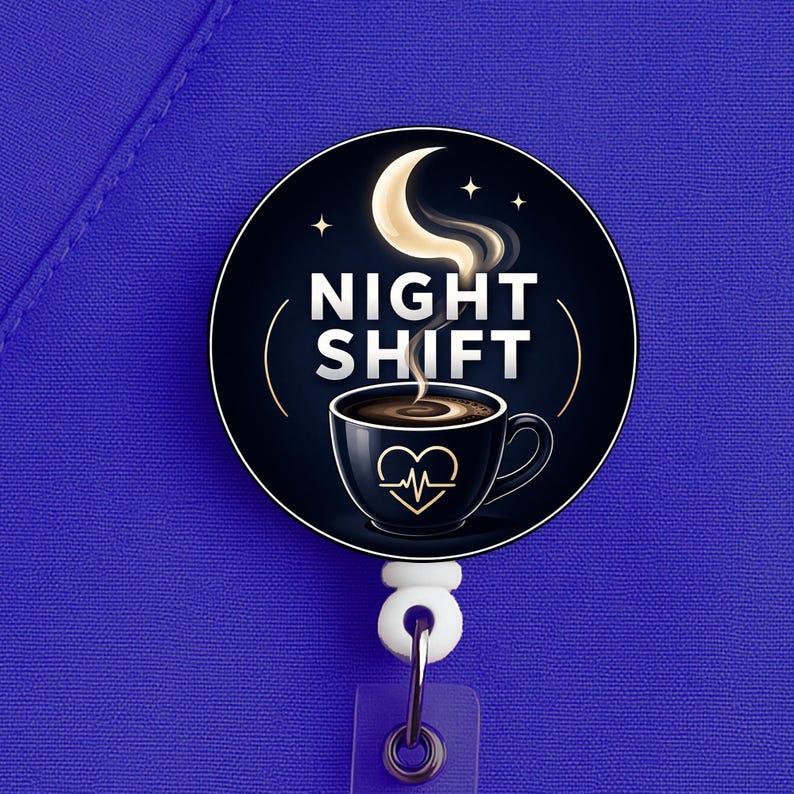 This night shift nurse badge reel features a coffee cup and moon design with the phrase “Night Shift,” made for nurses, RNs, LPNs, CNAs, techs, and healthcare workers who know overnight survival starts with coffee and ends with stubbornness.