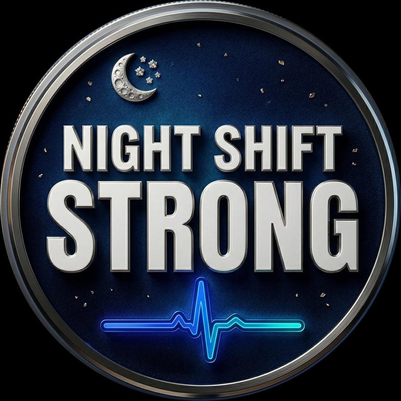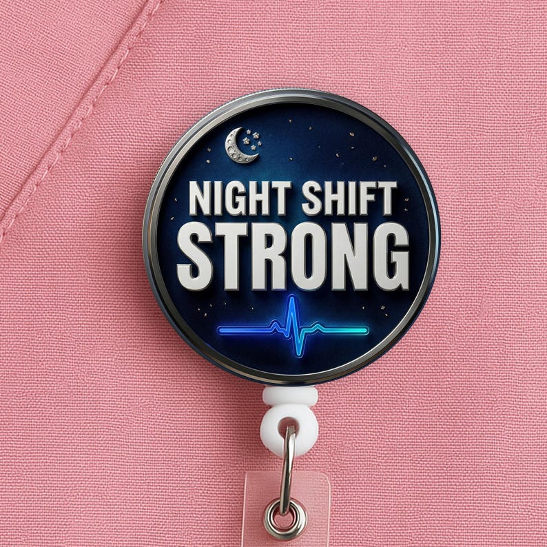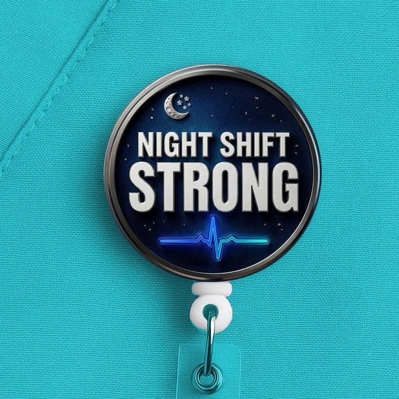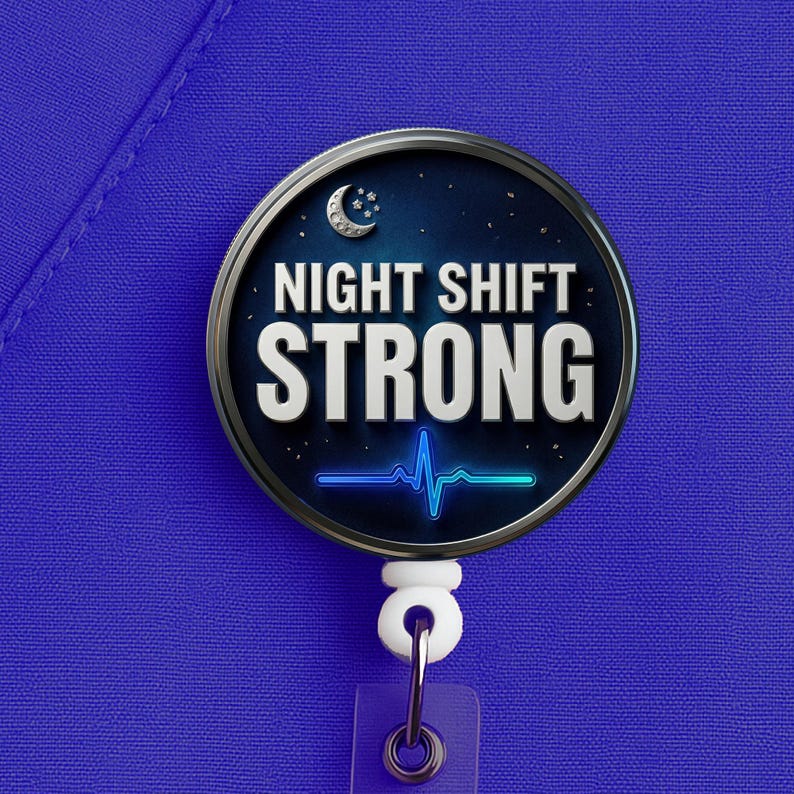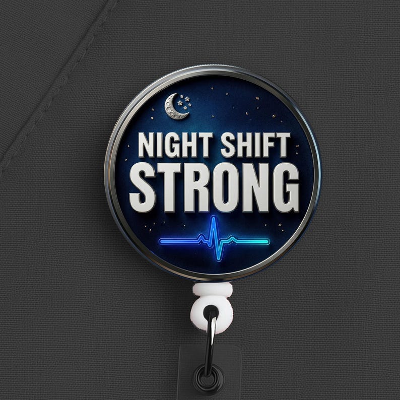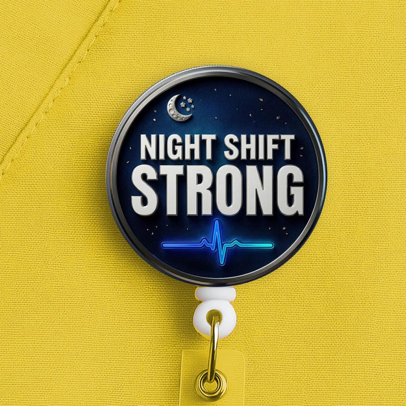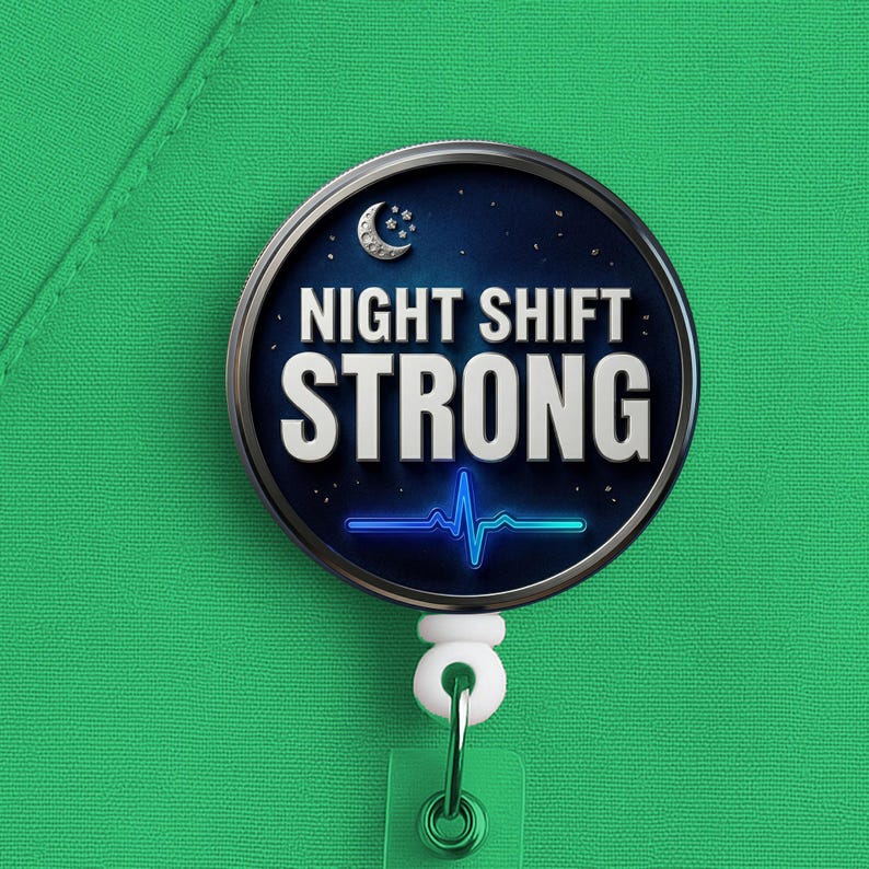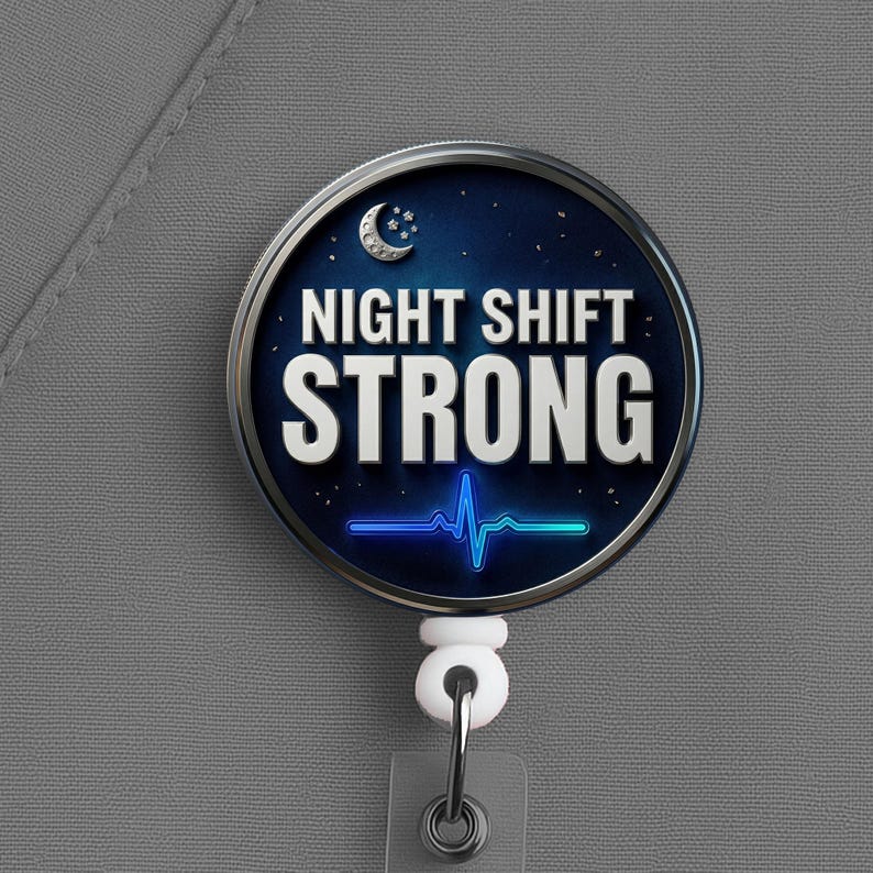 This night shift nurse badge reel features the phrase “Night Shift Strong” in a bold, clean design made for nurses, RNs, LPNs, CNAs, techs, and healthcare workers who handle overnights with grit, calm, and quiet confidence.