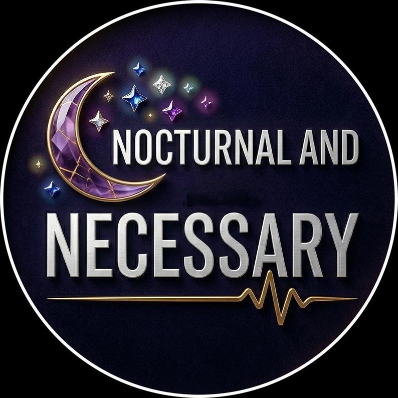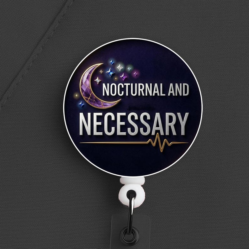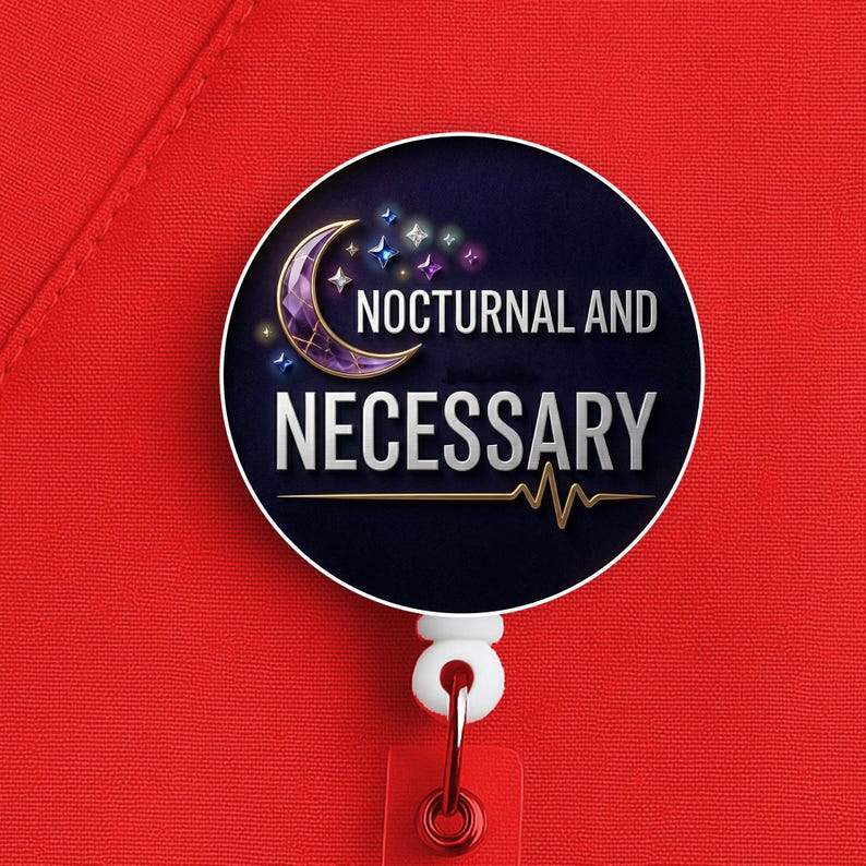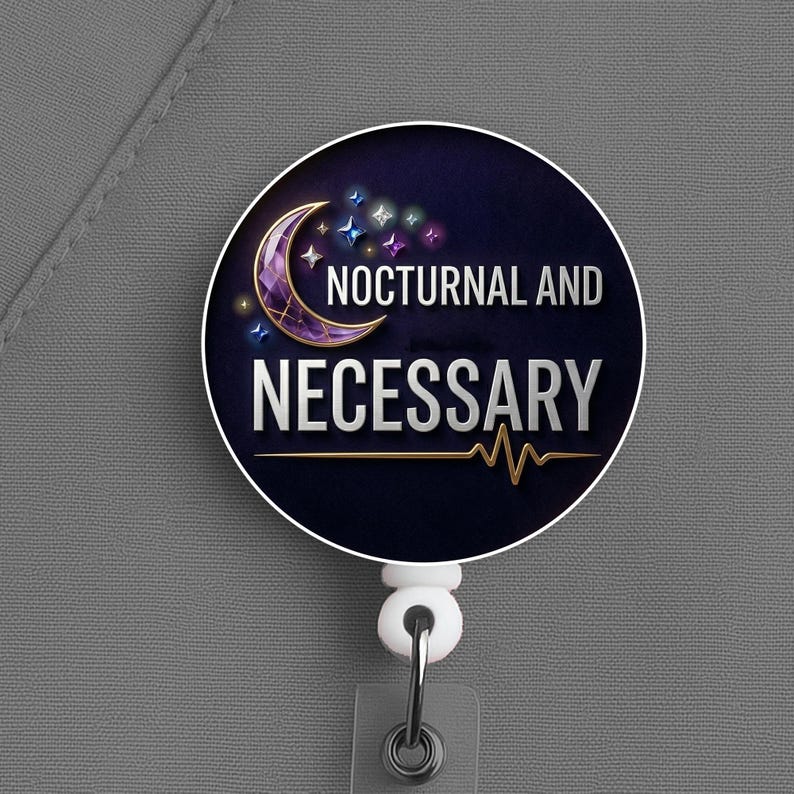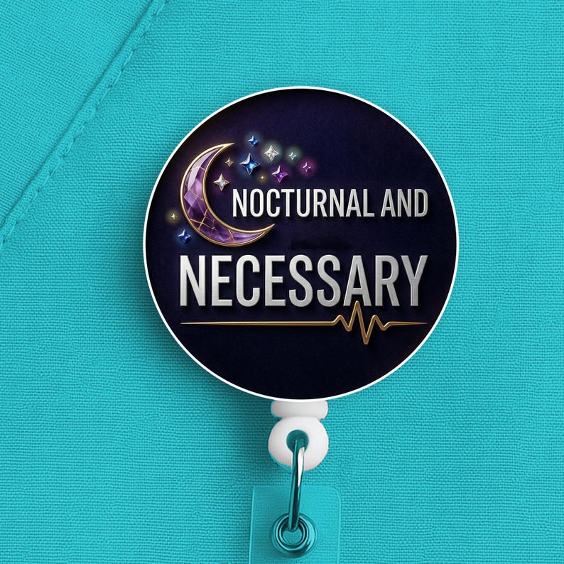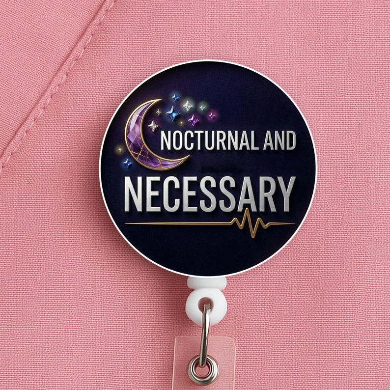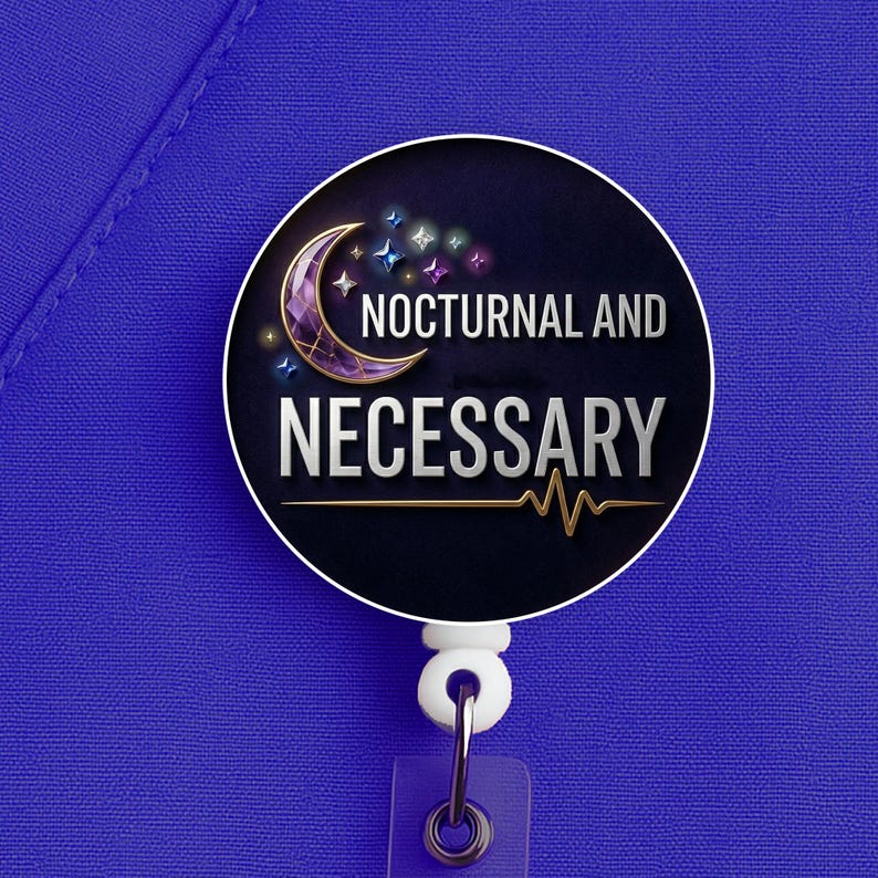 This night shift nurse badge reel features the phrase “Nocturnal and Necessary” in a bold, polished design made for nurses, RNs, LPNs, CNAs, techs, and healthcare workers who do their best work after dark and keep everything moving while the rest of the world sleeps.