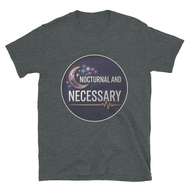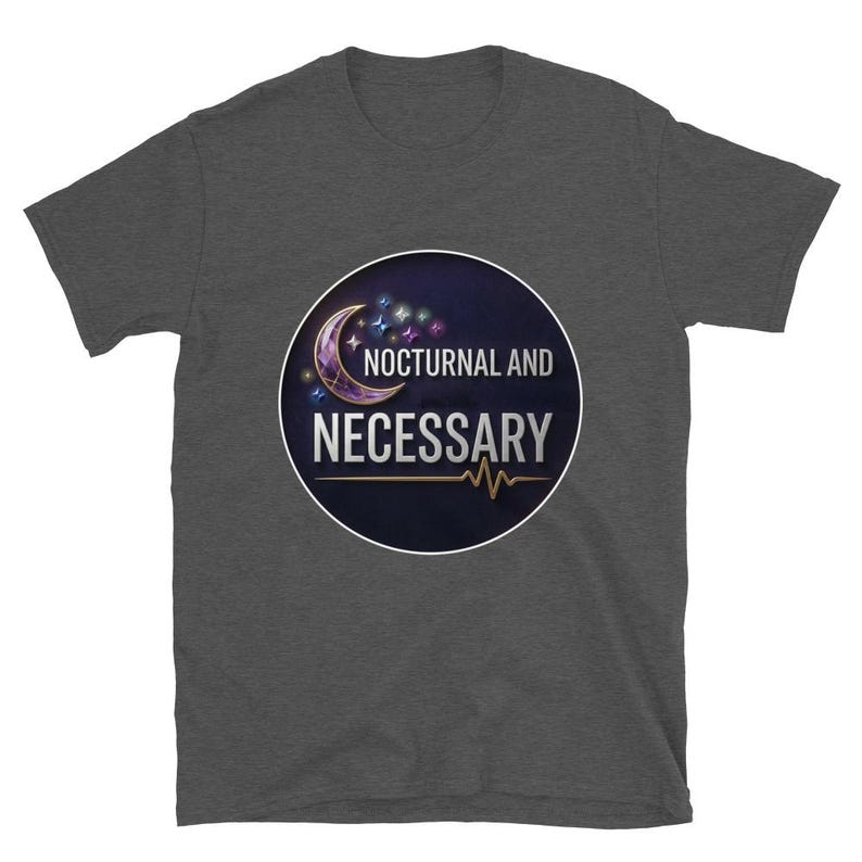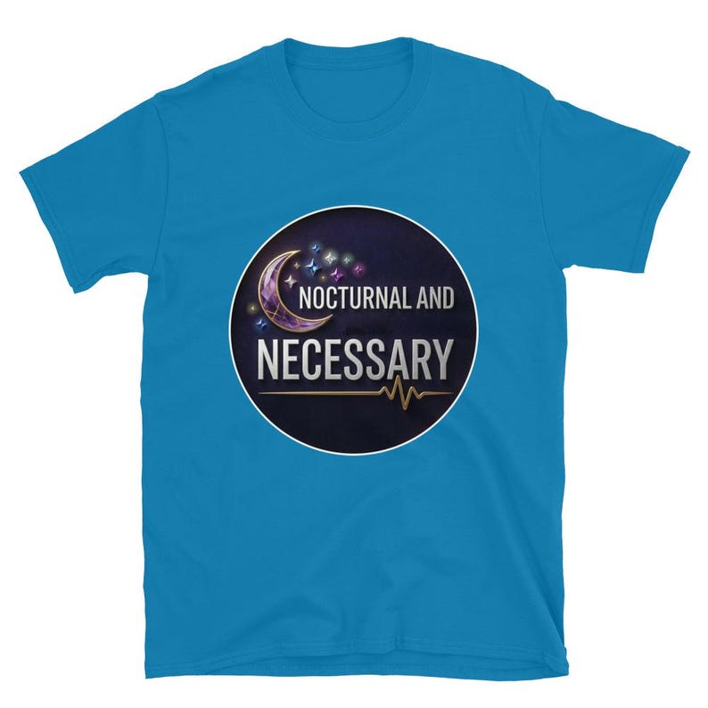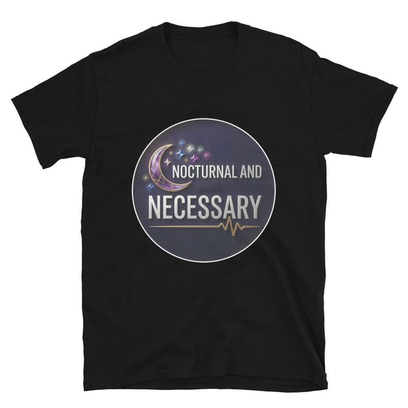 This night shift nurse shirt features the phrase “Nocturnal and Necessary” in a bold, polished design made for nurses, RNs, LPNs, CNAs, techs, and healthcare workers who do their best work after dark and keep everything moving while the rest of the world sleeps.