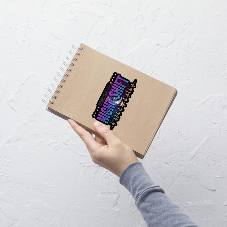 This artwork features oversized NIGHT SHIFT lettering with a vivid neon style fade, crescent moon, stars, watercolor sky effect, and a clean ECG line anchored with a medical symbol. It has strong visual impact and hits that sweet spot between proud nurse identity and after-dark survival mode.