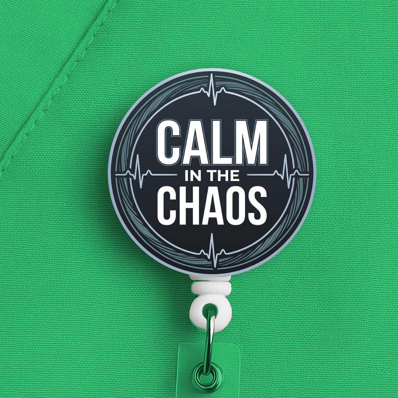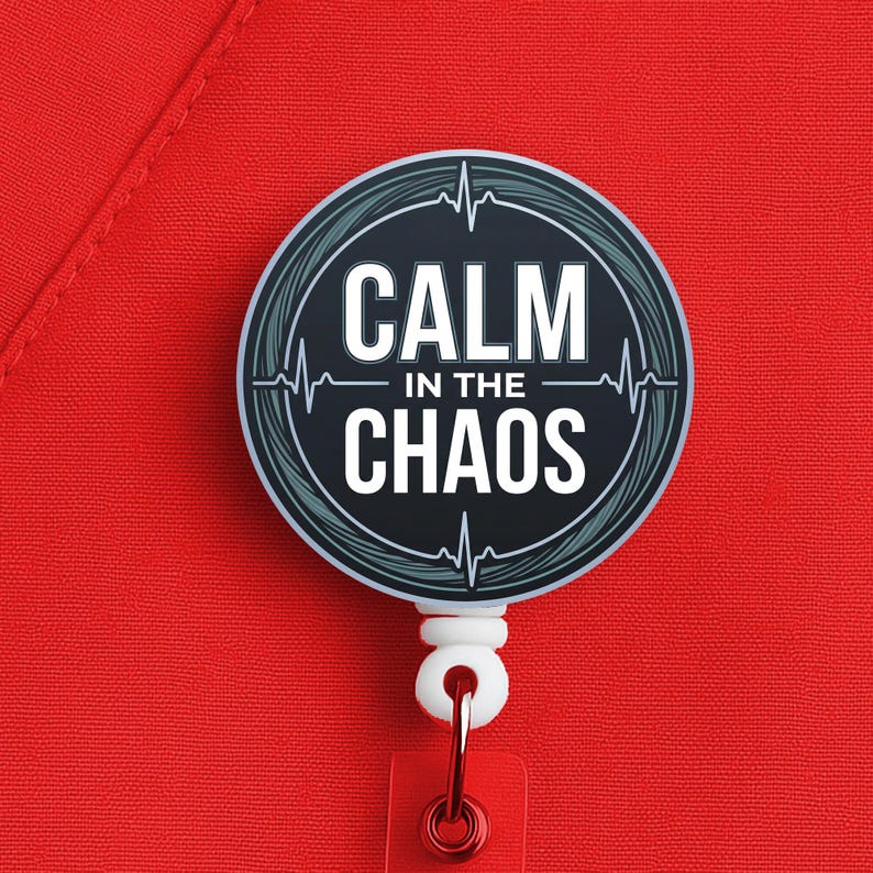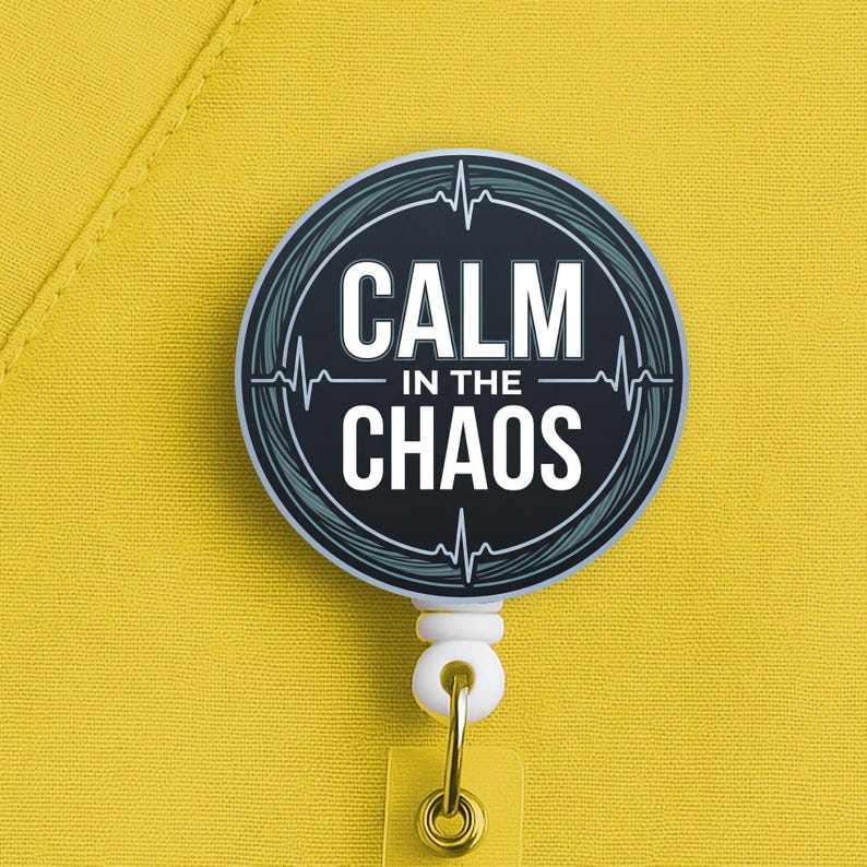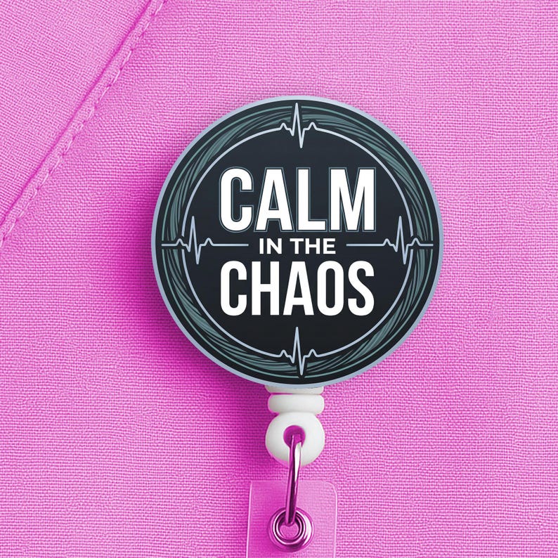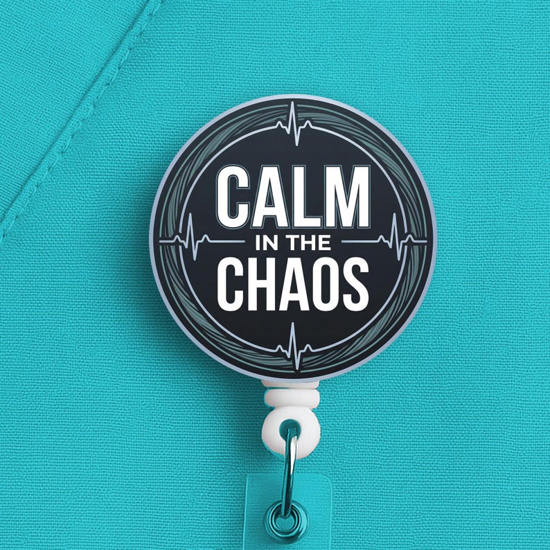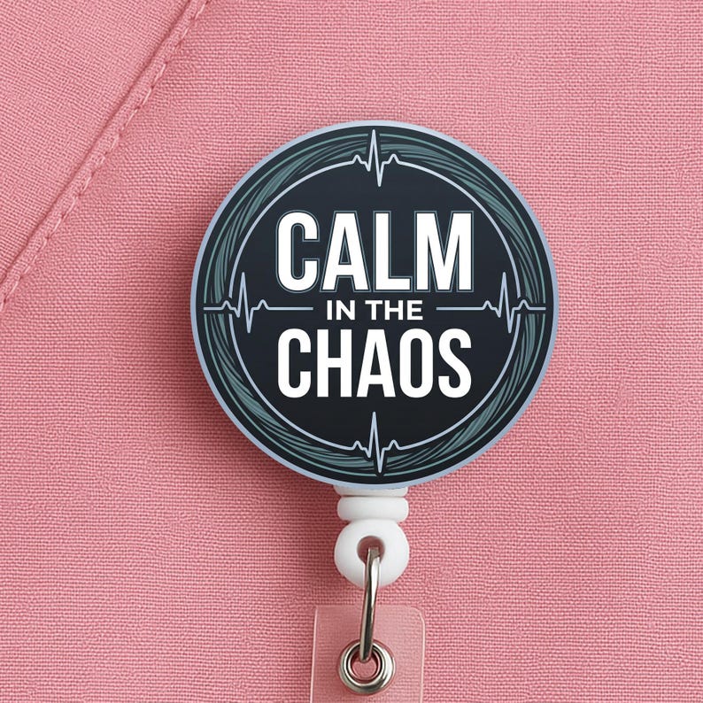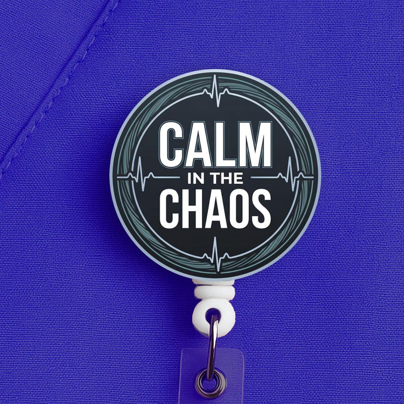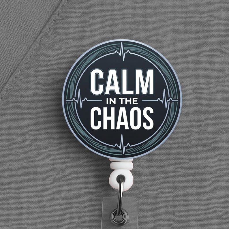 This nurse badge reel features the phrase “Calm in the Chaos” in a bold, clean design made for nurses, RNs, LPNs, CNAs, techs, and healthcare workers who keep their head clear when the pace gets ugly. It fits especially well for fast-paced settings where calm is not a personality trait, it is a survival skill.