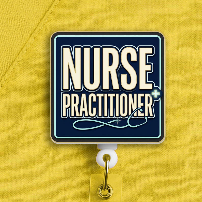 This nurse practitioner badge reel features a strong professional design made for NPs, nurse practitioners, advanced practice nurses, clinic staff, and healthcare workers who want a badge reel that is polished, easy to read, and work ready without extra clutter.
