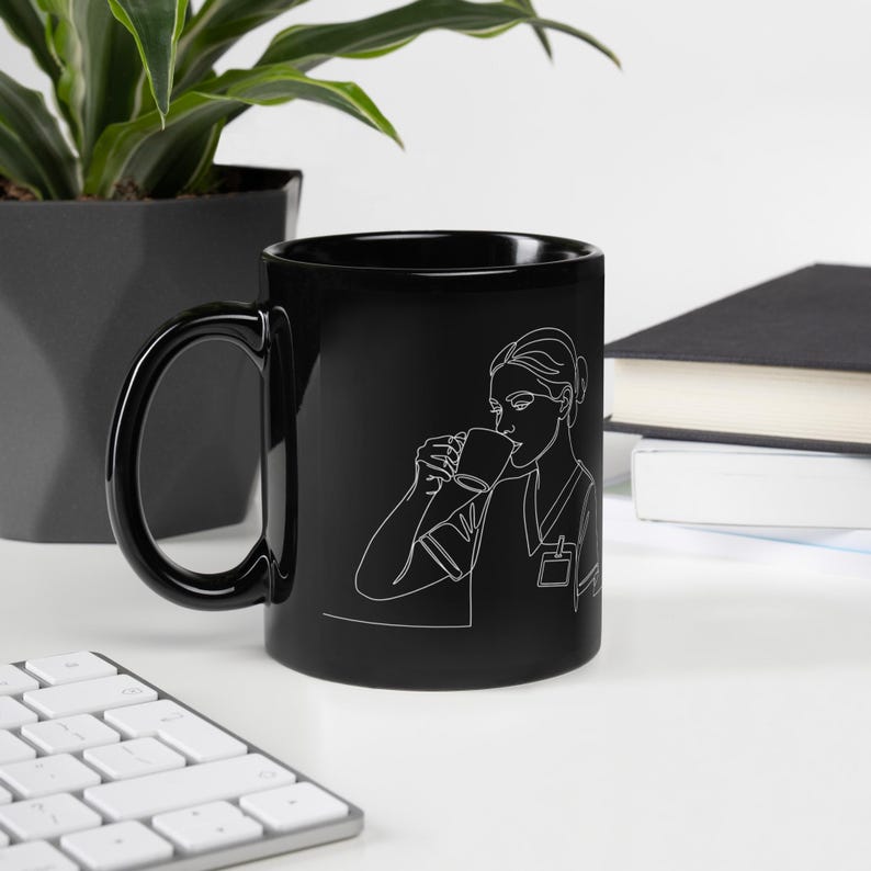 This black coffee mug features a minimalist one line drawing of a nurse in scrubs sipping coffee, creating a calm, modern design with a strong healthcare feel. It is a great everyday mug for nurses, RNs, LPNs, CNAs, nursing students, and other medical workers who basically function because coffee exists.