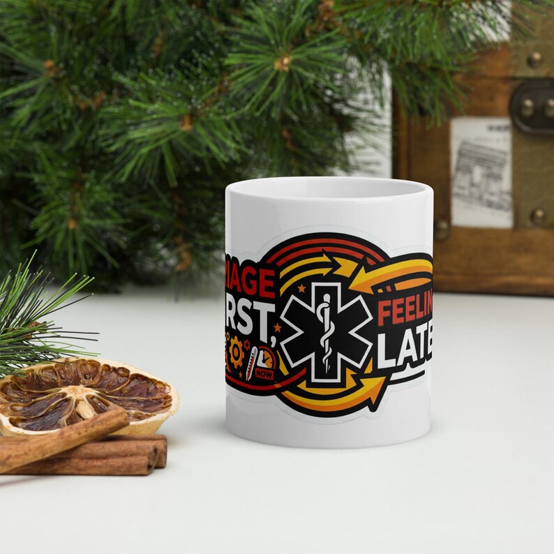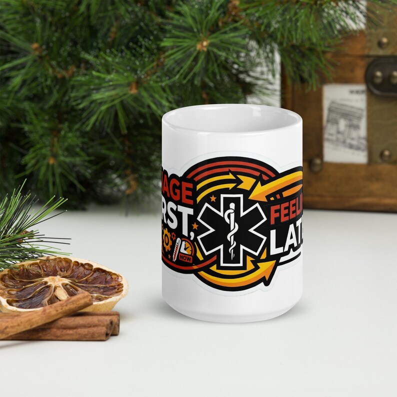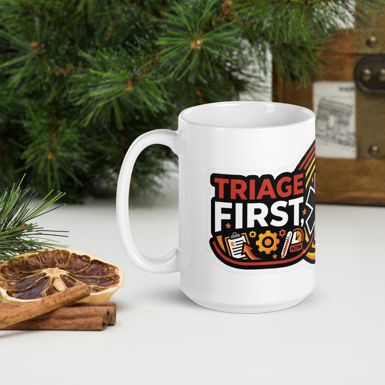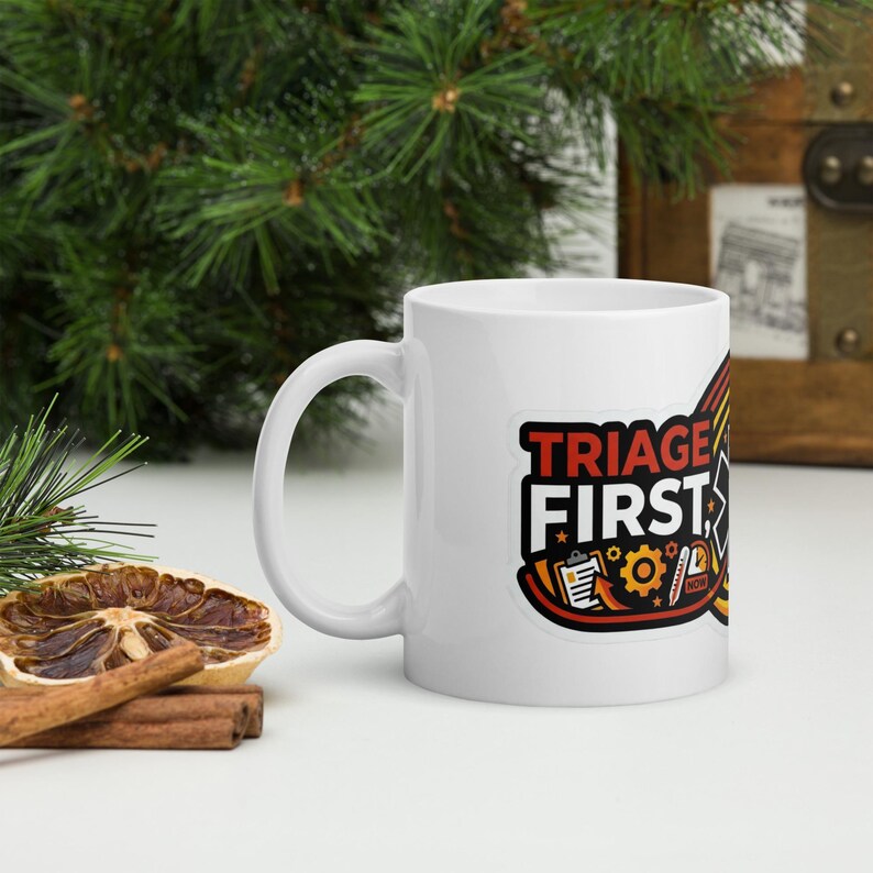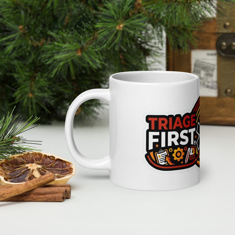 This nurse coffee mug features the phrase “Triage First, Feelings Later” in a bold medical design made for nurses, RNs, ER staff, ED teams, triage nurses, and healthcare workers who thrive in fast-moving chaos and keep the shift moving with skill, speed, and just enough sarcasm.