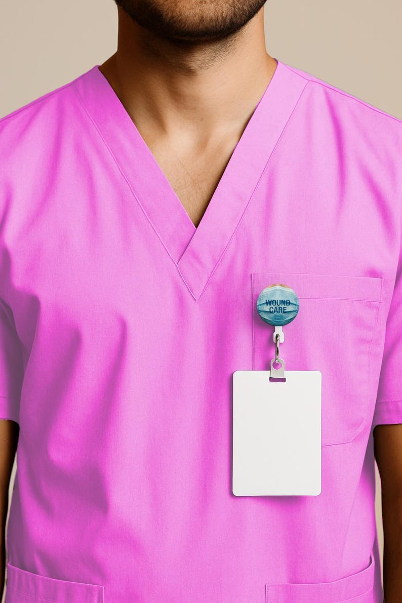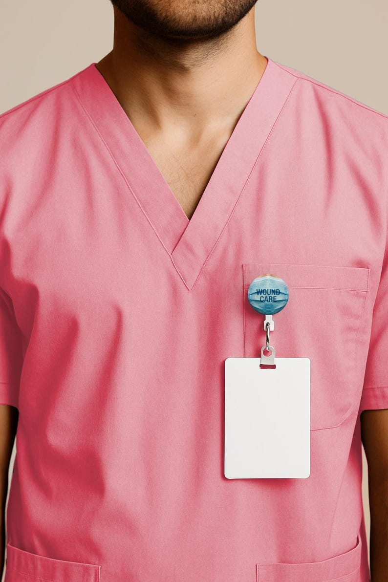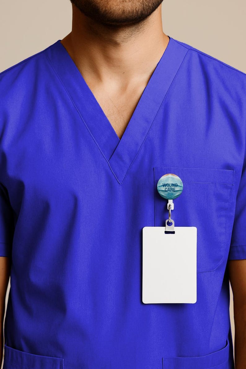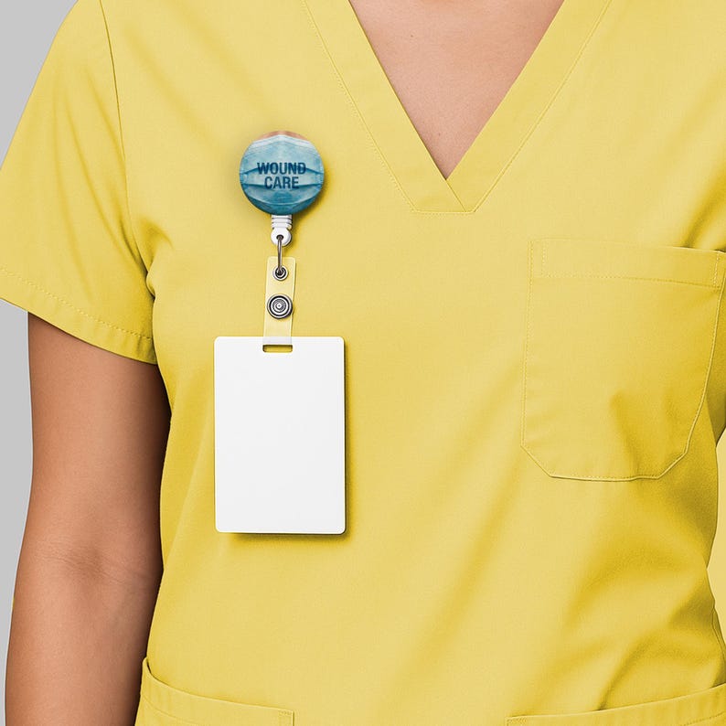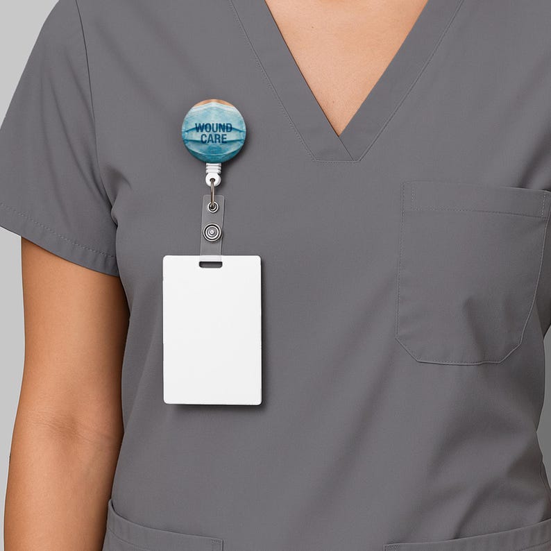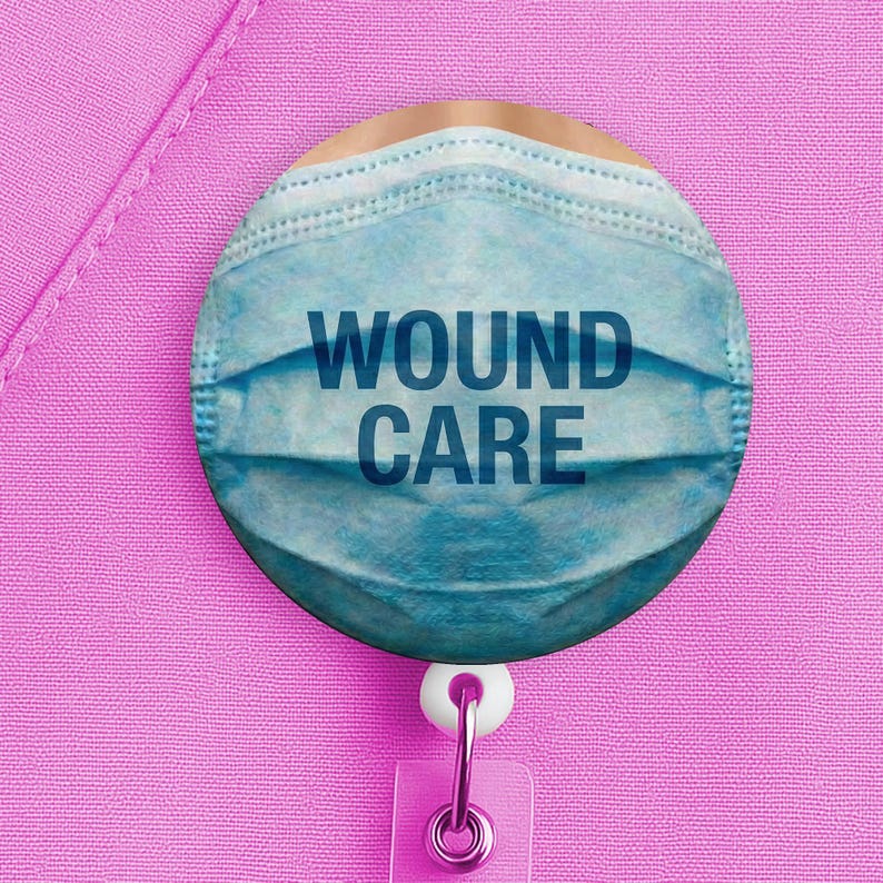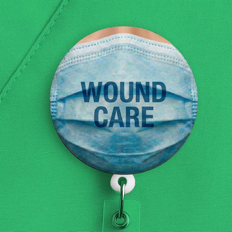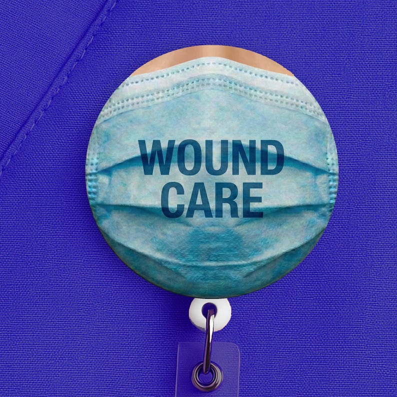 This uniquely designed badge reel features a realistic print of the iconic blue surgical mask, stamped boldly with “WOUND CARE.” It’s the perfect accessory for the specialists who handle the complex healing process with skill and compassion.