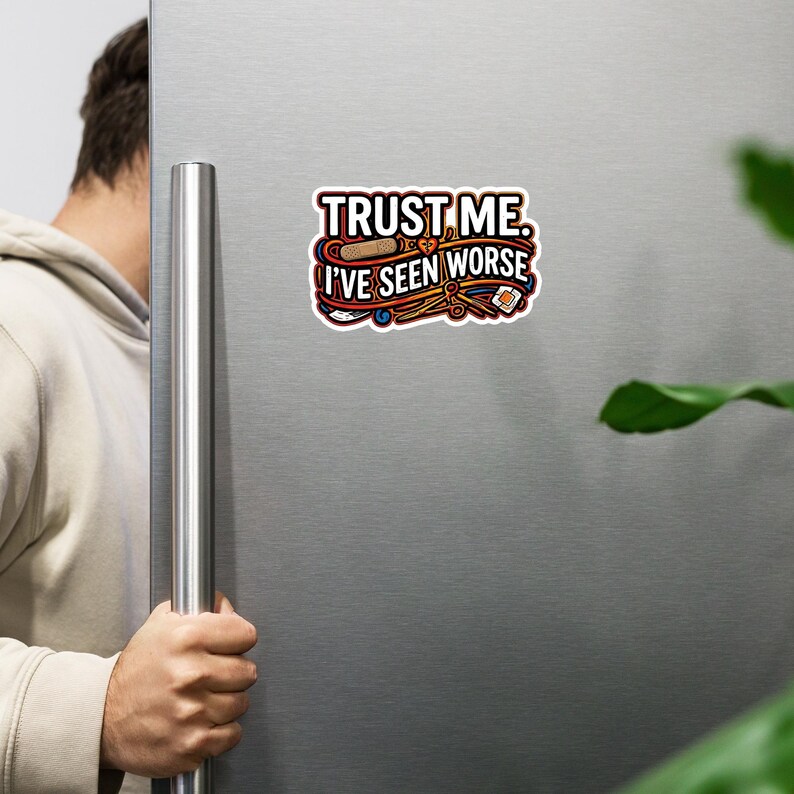 This funny wound care nurse magnet features the phrase “Trust Me I’ve Seen Worse” in a bold medical design that speaks fluent nurse sarcasm. It is perfect for wound care nurses, RNs, LPNs, clinic staff, and healthcare workers who have seen enough to earn a darker sense of humor.