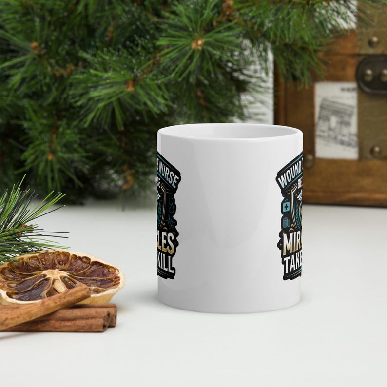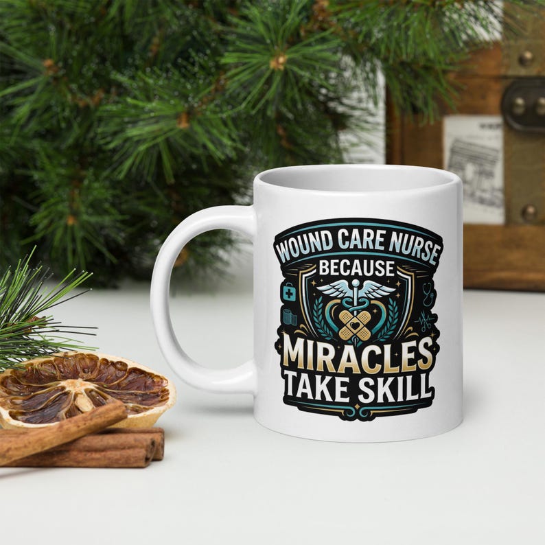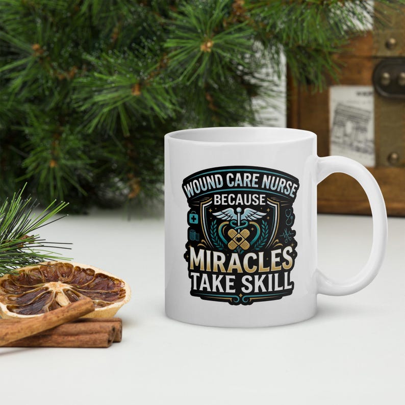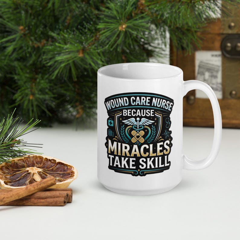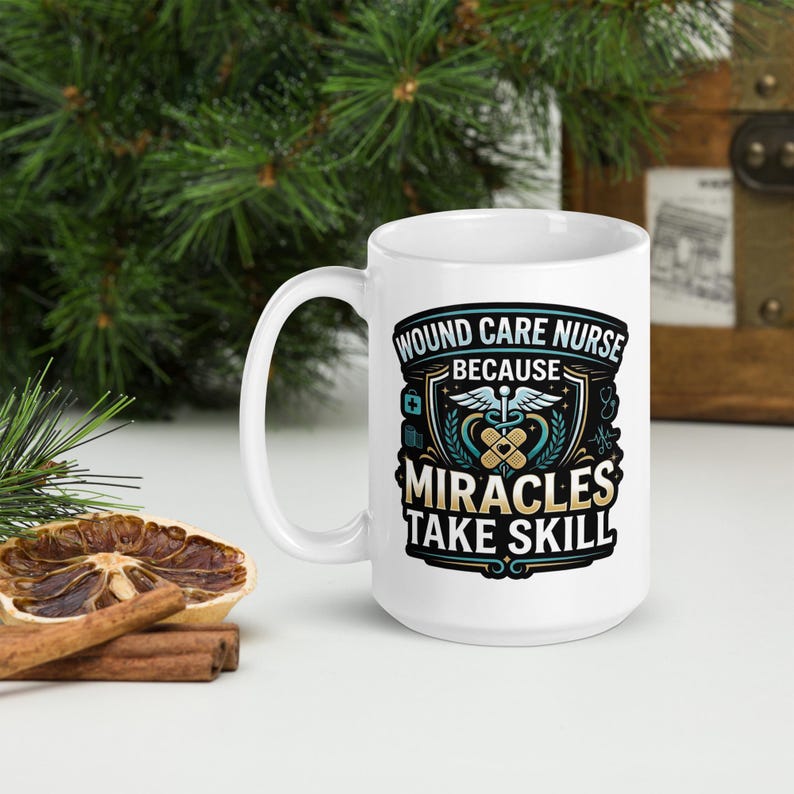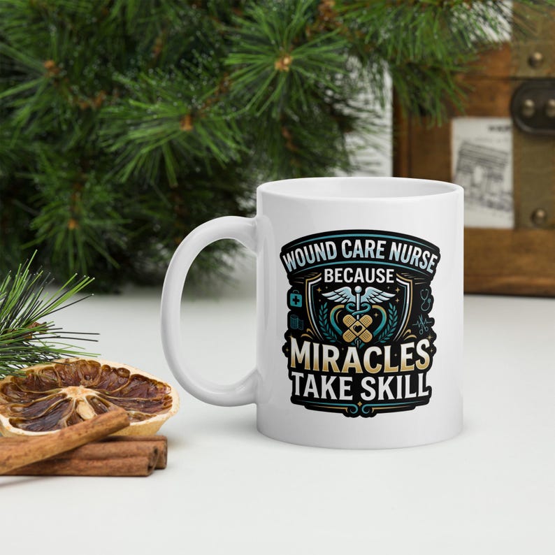 This wound care nurse coffee mug features the phrase “Wound Care Nurse Because Miracles Take Skill” in a bold medical design made for wound care nurses, RNs, LPNs, clinic staff, and healthcare workers who take pride in the skill, judgment, and care behind the work they do every day.