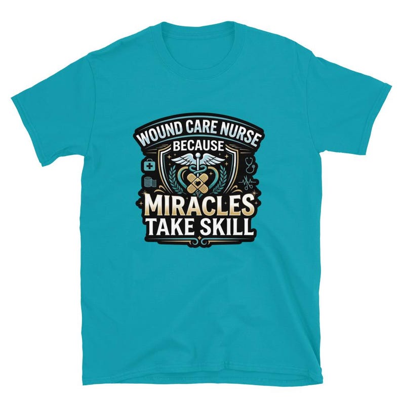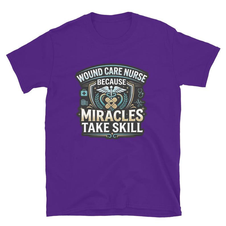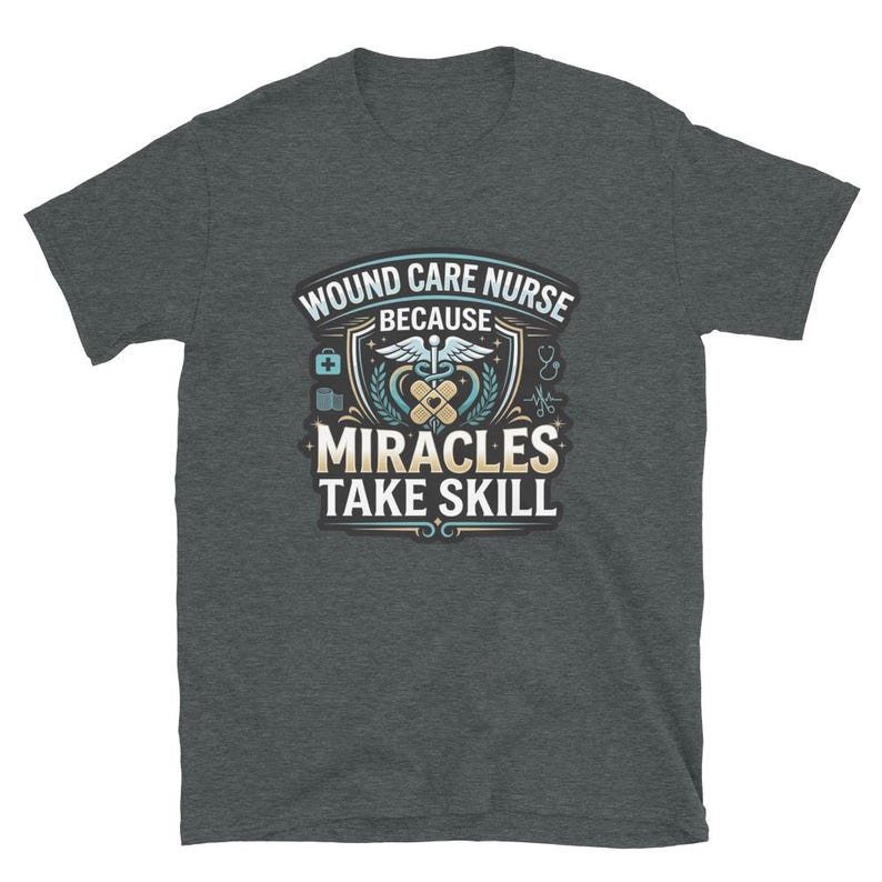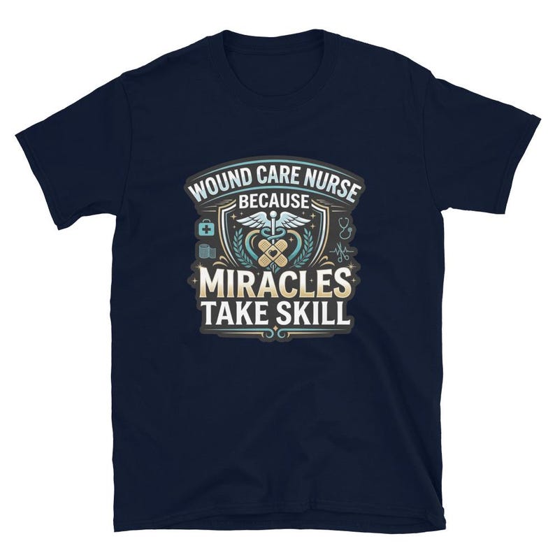 This wound care nurse shirt features the phrase “Wound Care Nurse Because Miracles Take Skill” in a bold medical design made for wound care nurses, RNs, LPNs, clinic staff, and healthcare workers who take real pride in what they do.